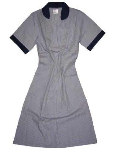 Work's a breeze in this semi-fitted step-in style striped uniform dress with contrast trim. Features a concealed snap fastening front, short sleeves, front kick pleat, one breast pocket, and two hip pockets. Superb Quality, made in the UK with an attention to detail for longer lasting performance. Poly/Cotton Blend is easy to care for.
